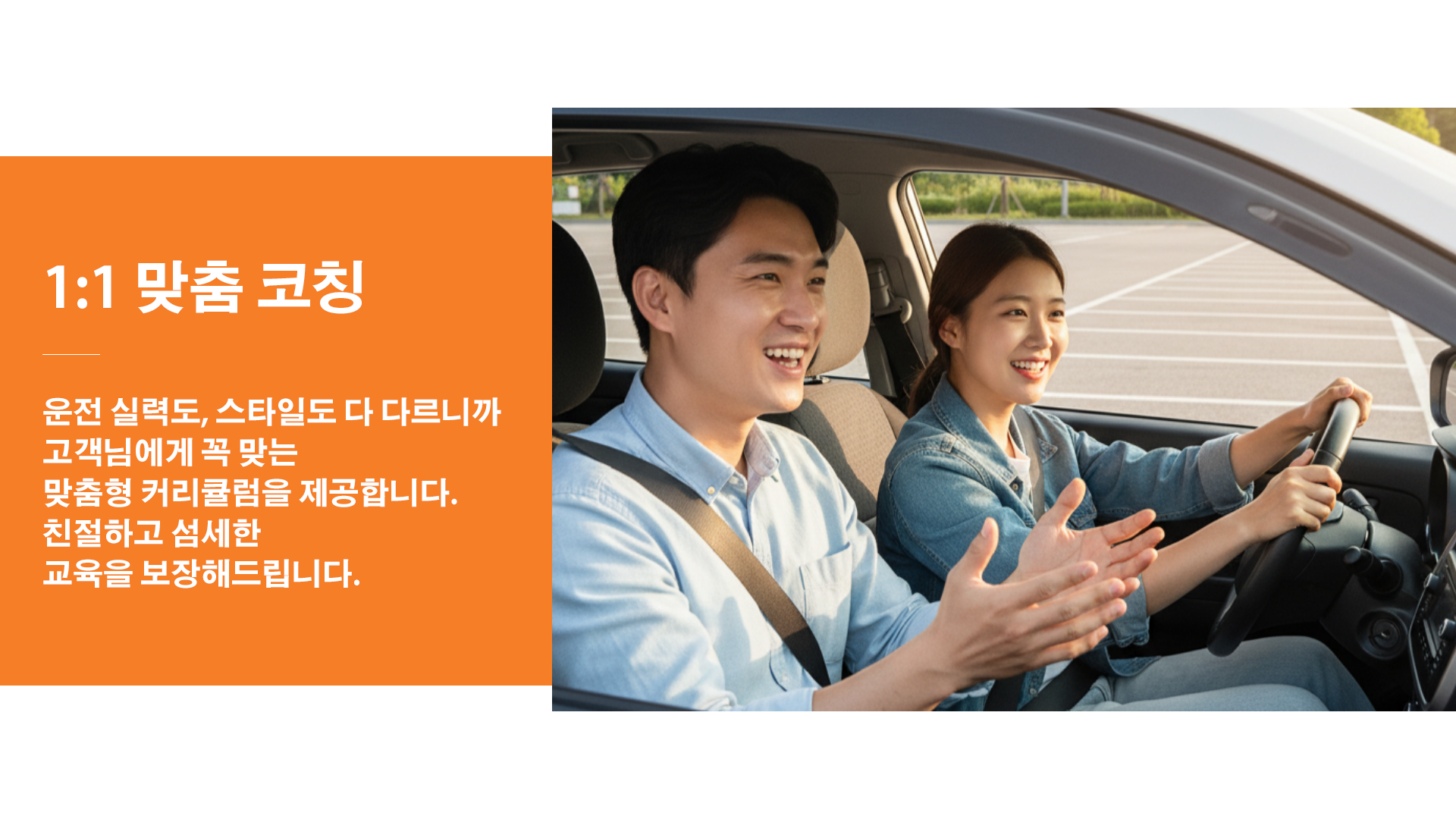 A4. 네. 여성 운전자가 자주 겪는 불안 요소(차로 변경, 주차, 야간 주행 등)를 중심으로 심리 안정 + 실전 감각 훈련이 결합된 맞춤형 커리큘럼을 제공합니다.